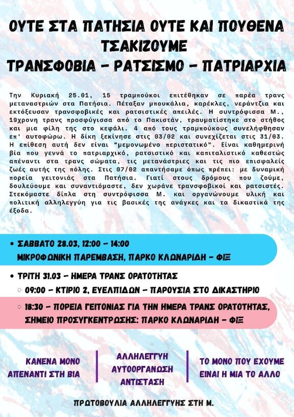 Τσακίζουμε τρανσφοβικούς σε κάθε γειτονιά: Η συνέχεια στις δράσεις μας για τη ρατσιστική, τρανσμισογύνικη επίθεση απέναντι στη Μ.