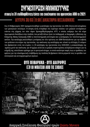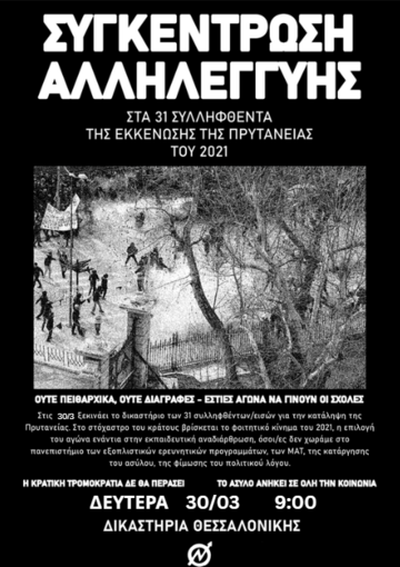 Την Δευτέρα 30/3, δικάζονται 31 αγωνιστές φοιτητές, που συνελήφθησαν στις τον Φεβρουάριο του 2021, επειδή συμμετείχαν σε κινητοποίηση των Φοιτητικών Συλλόγων στην Πρυτανεία του ΑΠΘ, ενάντια στον αντιεκπαιδευτικό νόμο Κεραμέως - Χρυσοχοΐδη (ν.4777), που έβαζε τα θεμέλια για την διάλυση της τριτοβάθμιας δημόσιας δωρεάν εκπαίδευσης.