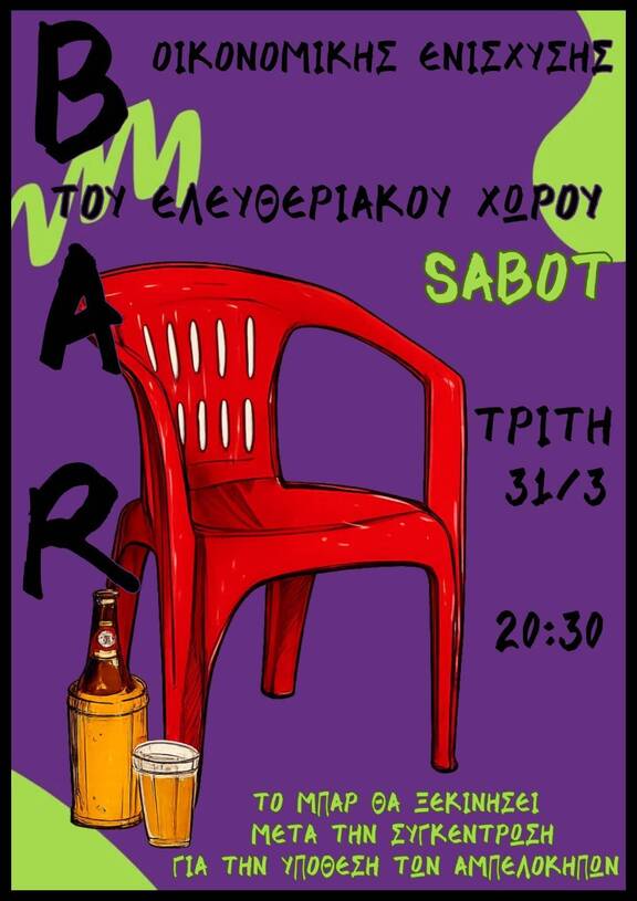 *Το μπαρ θα πραγματοποιηθεί μετά το πέρας της συγκέντρωσης για την υπόθεση των Αμπελόκηπων*