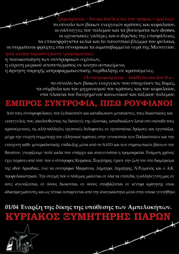 Την Τετάρτη 1 Απριλίου (9πμ), στο Β' τριμελές εφετείο κακουργημάτων στην Λουκάρεως (4ος όροφος αίθουσα Δ100Γ), ξεκινάει η δίκη για τα προφυλακισμένα συντρόφια μας που διώκονται για την υπόθεση της έκρηξης σε διαμέρισμα στους Αμπελόκηπους. Στα πλαίσια της διεθνούς εβδομάδας αλληλεγγύης στα προφυλακισμένα συντροφιά αλλά και υπεράσπισης της μνήμης του συντρόφου Κυριάκου Ξυμητηρη καλούμε σε μικροφωνικη συγκέντρωση την Τρίτη 24/03 στις 18.00 επί της Τσιμισκή με Γούναρη.