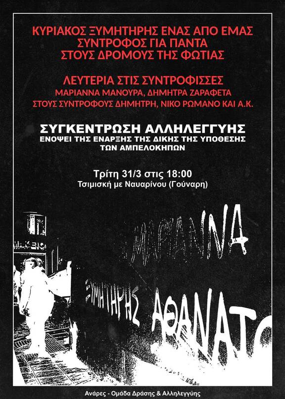 Η συγκέντρωση πραγματοποιείται στα πλαίσια της διεθνούς εβδομάδας δράσεων αλληλεγγύης 24-31/03 στα προφυλακισμένα συντρόφια της υπόθεσης των Αμπελοκήπων ενόψει της έναρξης της δίκης στη 1 Απρίλη στο Εφετείο Αθηνών. Στεκόμαστε με αμέριστη αλληλεγγύη στα φυλακισμένα συντρόφια που έρχονται αντιμέτωπα με την κρατική εξουσία, δικαστική και αστυνομική, με ένα διογκωμένο κατηγορητήριο, ως πάγια τακτική των διωκτικών αρχών και δη της αντιτρομοκρατικής υπηρεσίας που έχει στα χέρια της το νομικό οπλοστάσιο μέσω του 187Α ως φωτογραφικού νόμου αντεπανάστασης και αντιεξέγερσης προς τον αγωνιζόμενο κόσμο, ποινικοποιώντας φιλικές και συντροφικές σχέσεις, στοχοποιώντας αναρχικούς/ες αγωνιστές/ριες για τη μακροχρόνια δράση τους στον αγώνα για την κοινωνική και ταξική απελευθέρωση. Σε αυτό το πλαίσιο, υπερασπιζόμαστε αδιάλλακτα την μνήμη του αναρχικού συντρόφου Κυριάκου Ξυμητήρη που έπεσε μαχόμενος για την κοινωνική επανάσταση, ενάντια στο κυρίαρχο αφήγημα, πολιτικό και δημοσιογραφικό στην προσπάθεια σπίλωσης της μνήμης και των επιλογών του.