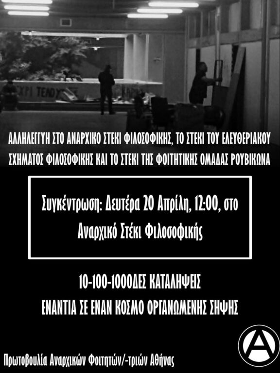 Αλληλεγγύη στο Αναρχικό Στέκι Φιλοσοφικής, το στέκι του Ελευθεριακού Σχήματος Φιλοσοφικής και το Στέκι της Φοιτητικής Ομάδας Ρουβίκωνα