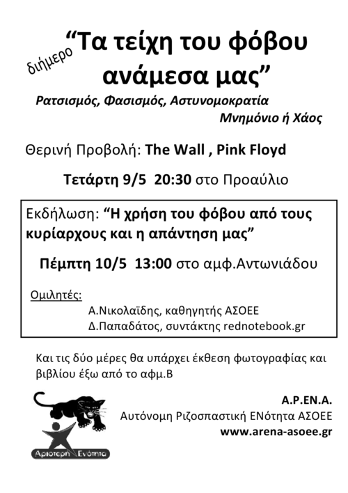 Η εκδήλωση γίνεται στα πλαίσια του διημέρου (9&10/5) "Τα τείχη του φόβου ανάμεσα μας" που διοργανώνει η Α.Ρ.Εν.Α.