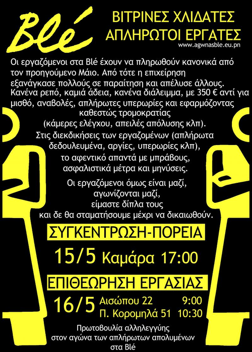 Εμείς ως απλήρωτοι, απολυμένοι έχουμε ξεκινήσει κινηματικό αγώνα με συνεχείς παραστάσεις διαμαρτυρίας έξω από τα καταστήματα ble και κάνοντας γνωστό το θέμα με αφίσες και κείμενα. Η απάντηση της εργοδοσίας ήταν μπράβοι στις πόρτες να εκτοξεύουν απειλές και βωμολοχίες με στόχο τον διαπληκτισμό. Πληρωμένοι μπράβοι στις πόρτες και απλήρωτοι πρώην και νυν εργαζόμενοι. Ακόμη, η τελευταία κίνηση του αφεντικού της χλιδάτης επιχείρησης ble, ήταν η αίτηση ασφαλιστικών μέτρων και μάλιστα άμεσα. 300μ για κάθε απολυμένο και για της ομάδες που οργανώνουν από κάθε κατάστημα, καθώς και 5000 ευρώ πρόστιμο και 6μηνη κράτηση σε περίπτωση παραβίασης των περιοριστικών μέτρων, με αισχρό πρόσχημα ότι απειλείτε η σωματική ακεραιότητα των ίδιων και των πελατών, καθώς και ότι διακόπτουμε την κίνηση στα καταστήματα εν μέσω Πάσχα και εκλογικής περιόδου. Στις 11/04 η αίτηση επειγόντων ασφαλιστικών μέτρων απορρίφθηκε και ορίστηκε δικάσιμος τον Ιούνιο.