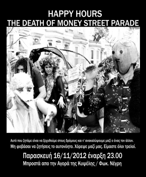 Το Happy Hours είναι μια ανοιχτή γιορτή στο δρόμο, μια παρέλαση που κάθε φορά ξεκινάει απο διαφορετικά σημεία της πόλης και επιθυμεί το σπάσιμο της μιζέριας και του φόβου μιάς πόλης που οι κυρίαρχοι θέλουν να πεθάνει.