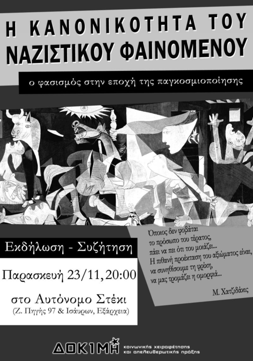 Η ΔΟΚΙΜΗ κοινωνικής χειραφέτησης & απελευθερωτικής πράξης σας καλεί σε συζήτηση με θέμα: « Η κανονικότητα του ναζιστικού φαινομένου. Ο φασισμός στην εποχή της παγκοσμιοποίησης»
