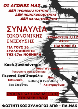 Φοιτητικοί σύλλογοι του ΑΠΘ-ΠΑΜΑΚ διοργανώνουν την Παρασκευή 7/6 στις 21:00 στο Ιβανώφειο συναυλία αλληλεγγύης και οικονομικής ενίσχυσης των 16 συλληφθέντων φοιτητών της 17ης του Νοέμβρη.