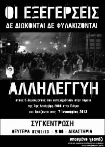 ΑΛΛΗΛΕΓΓΥΗ στους 5 συλληφθέντες της διαδήλωσης της 7ης Δεκέμβρη 2008 που δικάζονται στις 7 Γενάρη στην Πάτρα.