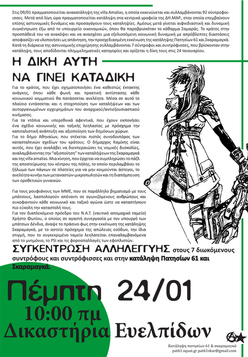 ΣΥΓΚΕΝΤΡΩΣΗ ΑΛΛΗΛΕΓΓΥΗΣ στους 7 διωκόμενους συντρόφοθς και συντρόφισσες και στην κατάληψη Πατησίων 61 και Σκαραμαγκά. Πέμπτη 24/01, 9 πμ δικαστήρια Ευελπίδων