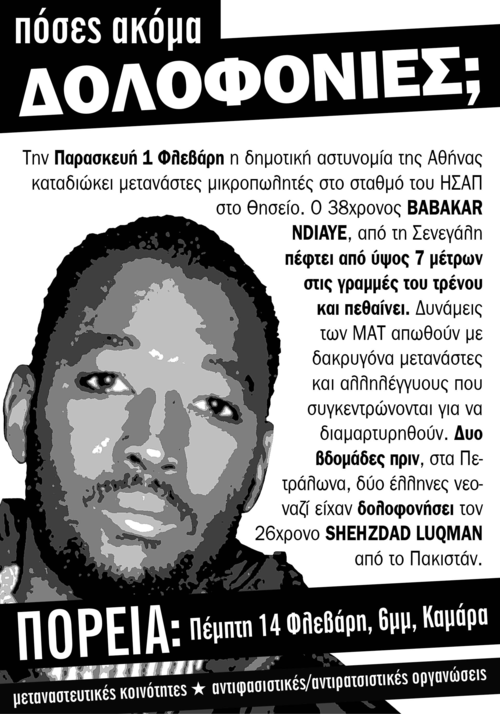 Την Παρασκευή 1η Φλεβάρη η δημοτική αστυνομία της Αθήνας καταδιώκει μετανάστες μικροπωλητές στο σταθμό του ΗΣΑΠ στο Θησείο. Ο 38χρονος Babakar Ndiaye από τη Σενεγάλη πέφτει από ύψος 7 μέτρων στις γραμμές του τρένου και πεθαίνει. Δυνάμεις των ΜΑΤ απωθούν με δακρυγόνα μετανάστες και αλληλέγγυους που συγκεντρώνονται για να διαμαρτυρηθούν. Δυο βδομάδες πριν, στα Πετράλωνα, δύο Έλληνες νεοναζί είχαν δολοφονήσει τον 26χρονο Shehzdad Luqman από το Πακιστάν.
