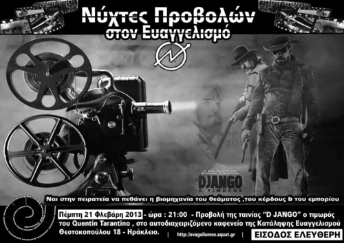 Nύχτες προβολών στον Ευαγγελισμό - Πέμπτη 21 Φλεβάρη 2013 - ώρα : 21:00 - Προβολή της ταινίας "D JANGO" ο τιμωρός του Quentin Tarantino , στο αυτοδιαχειριζόμενο καφενείο της Κατάληψης Ευαγγελισμού Θεοτοκοπούλου 18 - Ηράκλειο.