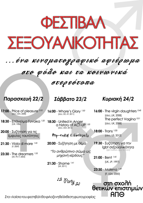 Το αυτόνομο σχήμα φυσικού δε συμμετέχει καθεαυτό στη διοργάνωση του φεστιβάλ σεξουαλικότητας. Ωστόσο επειδή θεωρούμε τα ζητήματα που θα ανοίξουν σημαντικά, αναδημοσιεύουμε τη σχετική αφίσα καλώντας κάθε συμφοιτητή και συμφοιτήτρια να παραβρεθεί. Επίπλέον επειδή η κοσμητεία απαγόρευσε τη διεξαγωγή του φεστιβάλ με το πρόσχημα ότι δε ζητήθηκε άδεια, αναδημοσιεύουμε και τη σχετική ανακοίνωση της ομάδας διοργάνωσης.