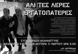 Στις 11 Μαρτίου του 2013 (μετά απο αναβολή της δίκης, στις 4 Απριλίου 2012, επειδή δεν εμφανίστηκε κανείς απο τους εργατοπατέρες της ΓΣΕΕ και της ΑΔΕΔΥ, οι οποίοι είναι οι μάρτυρες κατηγορίας) οι Ν.Μ., Δ.Β. και Κ.Π. καλούμαστε ξανά στα δικαστήρια της πρώην σχολής Ευελπίδων να δικαστούμε για την εκδίωξη του επαγγελματία εργατοπατέρα, επίδοξου βουλευτή και υπάλληλου του ΣΕΒ Παναγόπουλου από την απεργιακή συγκέντρωση που πραγματοποιήθηκε στις 5 Μαρτίου 2010 στο Σύνταγμα.