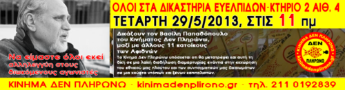 Έτσι την Τετάρτη 29/5/2013, στις 11 πμ, δικάζουν τον Βασίλη Παπαδόπουλο του Κινήματος Δεν Πληρώνω, μαζί με άλλους 11 κατοίκους των Αφιδνών.