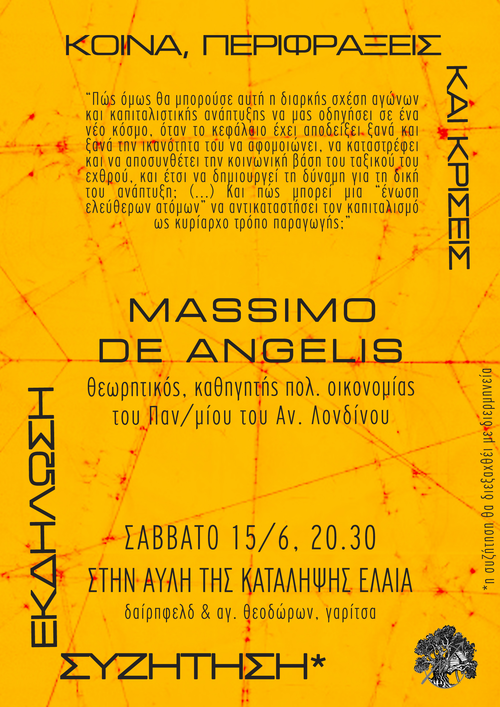 Το Σάββατο 15/6/2013 στις 20.30 στην Κατάληψη Ελαία θα πραγματοποιηθεί εκδήλωση-συζήτηση με τον θεωρητικό, καθηγητή Πολιτικής Οικονομίας στο Πανεπιστήμιο του Ανατολικού Λονδίνου, Massimo De Angelis.