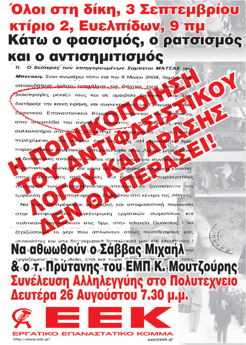 Πολύ αργότερα, τον Δεκέμβριο του 2012, μετά από μια σειρά ομιλιών του Σάββα Μιχαήλ σε αντιφασιστικές εκδηλώσεις, οι Ναζί κυκλοφορούν στο διαδίκτυο ένα κατάπτυστο λίβελλο με φωτογραφίες του γραμματέα του ΕΕΚ και με το δολοφονικό αντισημιτικό κάλεσμα «Λιώστε το Εβραϊκό σκουλήκι». Λίγο πριν, τον Νοέμβριο του 2012, οι ελληνικές κρατικές εισαγγελικές αρχές δέχτηκαν την μήνυση της ΧΑ του 2009 και διέταξαν ανακρίσεις από την ΓΑΔΑ.