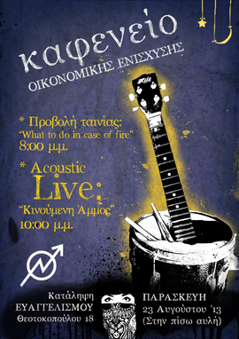 για την οικονομική ενίσχυση της κατάληψης Ευαγγελισμού.Παρασκεύη 23 Αυγούστου στις 8 μ.μ. θα προβληθεί η ταινία Whta to do in case of Fire, ακολουθεί ακουστικό Live με το σχήμα "Κινούμενη Άμμος" και μετά θα ακολουθήσει καφενείο στη πίσω αυλή.