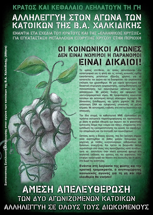 Από την πλευρά μας στεκόμαστε αλληλέγγυοι στον δίκαιο αγώνα των κατοίκων της περιοχής για την προάσπιση της φύσης και της ζωής τους ενάντια στα συμφέροντα των πολυεθνικών εταιριών εξόρυξης χρυσού και του κράτους. Στεκόμαστε αλληλέγγυοι στους δυο προφυλακισμένους αγωνιστές απαιτώντας την άμεση απελευθέρωσή τους και σε όλους τους διωκόμενους. Αυτός ο αγώνας, που δεν ξεκίνησε σήμερα αλλά αναπτύχθηκε σε βάθος χρόνου, πολύμορφα και μαχητικά με πλήθος κινητοποιήσεων, εκδηλώσεων και δράσεων, και που συνεχίζεται αδιάλειπτα, πρέπει να πλατειάσει ακόμα περισσότερο. Να αγκαλιαστεί από όλους όσοι αγωνίζονται «από τα κάτω» ενάντια στην σύγχρονη βαρβαρότητα και να αποτελέσει έναν πλατύ κοινωνικό φραγμό στην λεηλατική επέλαση του κράτους και του κεφαλαίου, που επιφέρει καταστροφή και θάνατο στις κοινωνίες και τη φύση, στο βωμό της ανάπτυξης.