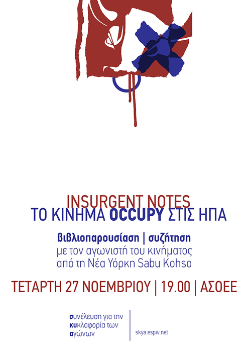 Με αφορμή την έκδοση του βιβλίου με τίτλο "Το κίνημα occupy στις ΗΠΑ" από την συλλογικότητα Insurgent Notes σε μετάφραση της Συνέλευσης για την Κυκλοφορία των Αγώνων, θα πραγματοποιηθεί βιβλιοπαρουσίαση με ταυτόχρονη παρουσία αγωνιστή - συμμετέχοντα στο κίνημα Occupy New York την Τετάρτη 27/11 στις 19:00 στην ΑΣΟΕΕ.