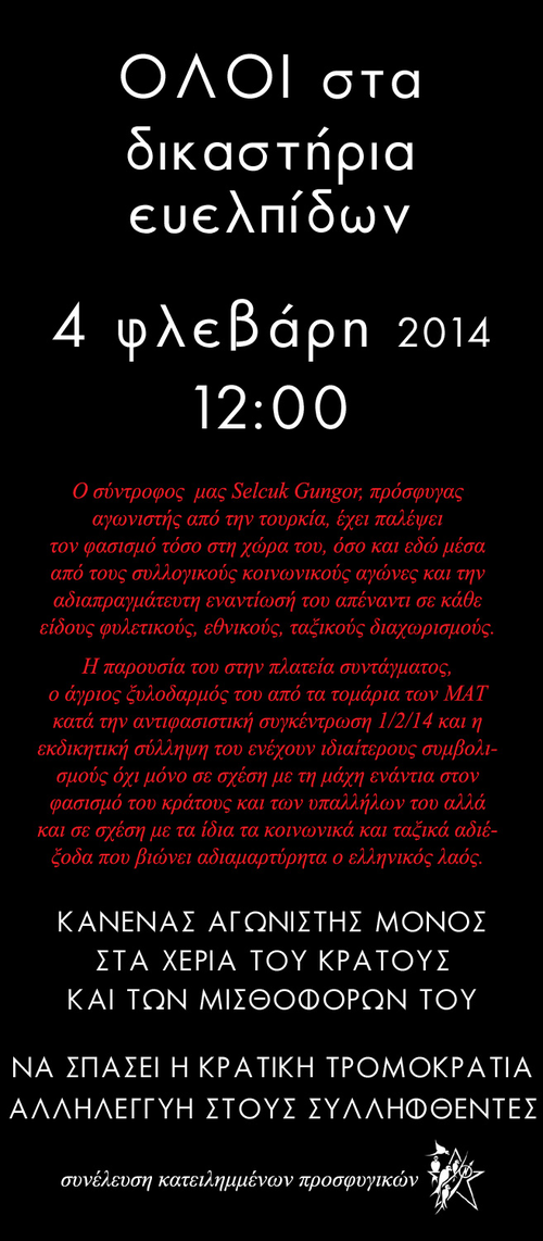 Την Κυριακή 2-2-14 ο σύντροφός μας Selcuk Gungor‏‏ οδηγήθηκε στα δικαστήρια της Ευελπίδων όπου πέρασε από εισαγγελέα, ο οποίος, λόγω κακουργηματικής κατηγορίας, τον παρέπεμψε σε ανακριτή. Λόγω ημέρας (Κυριακή), δεν υπήρχε τακτικός ανακριτής και γι'αυτό πέρασε από ειδική ανακρίτρια για την τυπική διαδικασία της παραπομπής σε τακτικό ανακριτή, η οποία θα πραγματοποιηθεί την Τρίτη 4 Φεβρουαρίου 2014 στα Δικαστήρια Ευελπίδων. Καθώς κατηγορείται για κακούργημα, κρατείται στον 6ο στη ΓΑΔΑ μέχρι να περάσει από τον τακτικό ανακριτή..