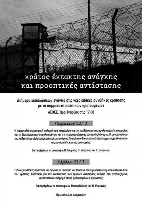 Σάββατο 22 Μαρτίου: Ειδικές συνθήκες κράτησης και αγώνες σε Ευρώπη και Τουρκία. Η οχύρωση του νομικού οπλοστασίου του κράτους. Συζήτηση για την ιχνηλάτηση των τρόπων αντίστασης ενάντια στη σχεδιαζόμενη κατασταλτική επιδρομή εναντίον των φυλακισμένων αγωνιστών.
