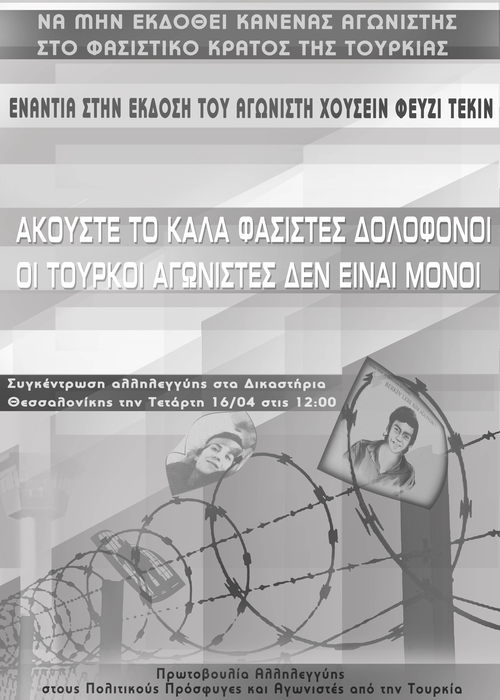 Συγκέντρωση Αλληλεγγύης την Τετάρτη 16/04 , στις 12.00 στα Δικαστήρια Θεσσαλονίκης ενάντια στην έκδοση τoυ Χουσεϊν Φευζί Τεκίν στη Τουρκία.