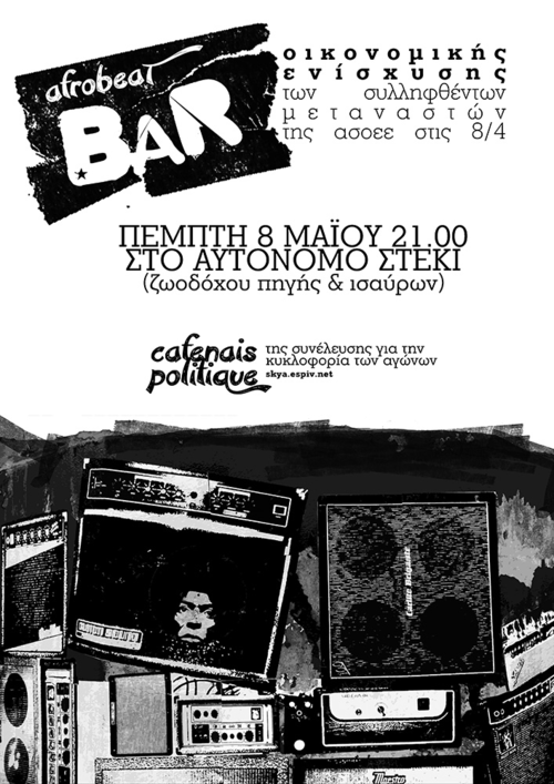 Τέλος σεζόν για το Cafenais Politique της Συνέλευσης για την Κυκλοφορία των Αγώνων και αυτή την Πέμπτη, πραγματοποιούμε την τελευταία προ-καλοκαιρινή κάθοδο στα σκαλιά του Αυτόνομου Στεκιού για ένα μπαρ αφιερωμένο στο afrobeat και άλλες νεότερες μουσικές της Αφρικής που συνδυάζουν τα ρυθμικά του φανκ με τα τζαζ πνευστά, τις πολυφωνίες και τις μελωδίες των συνθεσάιζερ. Τα έσοδα αυτή τη φορά θα δοθούν για τα δικαστικά έξοδα των συλληφθέντων μεταναστών της ΑΣΟΕΕ που εδώ και χρόνια δίνουν έναν δύσκολο αγώνα επιβίωσης ενάντια στις κατασταλτικές πρακτικές του κράτους έκτακτης ανάγκης και των διάχυτων ρατσιστικών μηχανισμών αποκλεισμού. Μουσική, ποτά και σοσιαλάιζινγκ για καλό σκοπό λοιπόν, αυτή την Πέμπτη, 8 Μαΐου, στο Αυτόνομο Στέκι (Ζωοδόχου Πηγής και Ισαύρων) στα Εξάρχεια.
