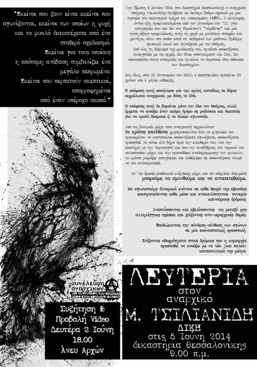 Την Πέμπτη 5 Ιουνίου του 2014 εκδικάζεται ,σε δεύτερο βαθμό (εφετείο), η υπόθεση του αναρχικού Μπάμπη Τσιλιανίδη. Στα τέλη του 2011 ,και ενώ ο σύντροφος βρισκόταν ήδη προφυλακισμένος κατηγορείται για μια υπόθεση του 2010,που αφορά ληστεία στο οικονομικό τμήμα του νοσοκομείου ΑΧΕΠΑ .