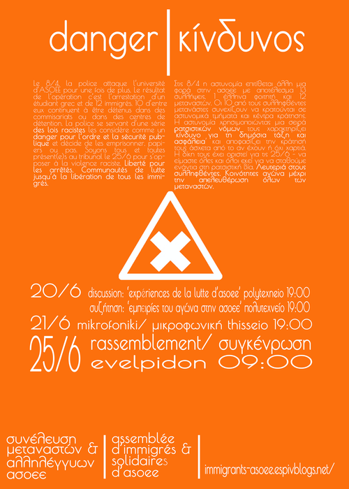 Αφήνοντας πίσω τις χώρες μας, πιστεύαμε ότι, τουλάχιστον, θα συνεχίζαμε να ζούμε ελεύθεροι. Την ελευθερία μας αυτή όμως τη στερηθήκαμε την στιγμή που μπήκαμε στην Ελλάδα, ακόμα κι αν το να μπούμε σήμαινε ότι έπρεπε να ρισκάρουμε να χάσουμε τη ζωή μας στη θάλασσα. Κι αφού λοιπόν μπήκαμε, βρεθήκαμε σε μια ανοιχτή φυλακή, σε μια φυλακή χωρίς τοίχους. Μας συκοφαντούν μέσα από ρατσιστικές καμπάνιες παραπληροφόρησης. Για τα μίντια είμαστε κλέφτες, δολοφόνοι, φορείς ασθενειών Μέσα από ρατσιστικούς όσο και απαρχαιωμένους νόμους μας εμποδίζουν να εργαστούμε. Οι μπάτσοι, οι φασίστες, οι ρατσιστές μας κυνηγάνε στους δρόμους. Και δεν είναι μόνο η Ασοεε. Είναι το Θησείο, το Μοναστηράκι, η Ομόνοια, οι γειτονιές μας. Κάθε μέρα τη ζούμε κάτω από την απειλή της φυλάκισης είτε σε ένα αστυνομικό τμήμα είτε σε κάποιο κέντρο κράτησης. Και ο χρόνος κράτησης όλο και αυξάνεται: στην αρχή ήταν τρεις, έπειτα έξι, εννιά, τώρα δεκαοκτώ μήνες ή επ' αόριστον.