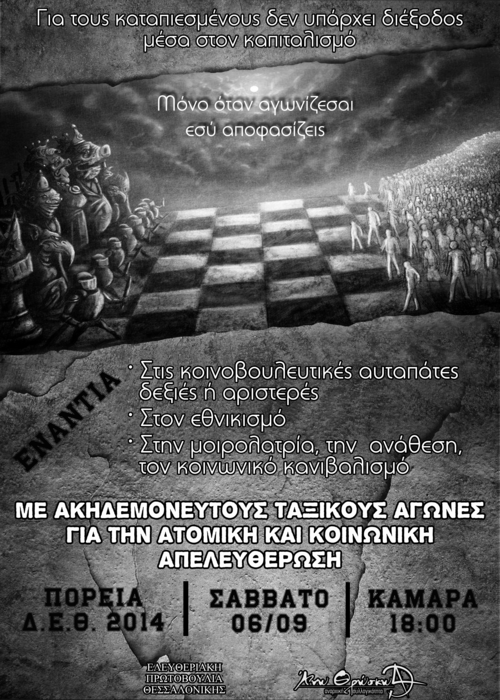Το αγωνιστικό και κινηματικό ραντεβού στην φετινή ΔΕΘ, είναι αναγκαίο να αποτελέσει σημείο εκκίνησης για την αλλαγή ρότας του εργατικού κινήματος. Σε αυτή την κατεύθυνση, το ζήτημα της πολιτικής ανεξαρτησίας του εργατικού κινήματος, από κράτος, κυβέρνηση, αφεντικά και συνδικαλιστική γραφειοκρατία που έθεσε εξαρχής η Πρωτοβουλία για ένα Ανεξάρτητο Κέντρο Αγώνα Εργατών με αφορμή την ΔΕΘ και η ανεξάρτητη ταξική συγκέντρωση και πορεία από την εργοδοτική και συνδικαλιστική γραφειοκρατία, αποτελεί πρωταρχική και αδιαπραγμάτευτη προϋπόθεση. Η μάχη για την ανατροπή της κυβέρνησης, την κατάργηση των μνημονίων, την μονομερή διαγραφή του χρέους, την διασφάλιση των δικαιωμάτων στην δουλειά, στην υγεία, στην στέγη, στην τροφή, είναι μια συνολική πολιτική μάχη, που αφορά το όλο της ζωής των εργαζόμενων.Η κρίση δεν ανήκει στο χθες. Η καταστροφή είναι ήδη συντελεσμένη - και συνεχίζεται επ' αόριστον. Η διεθνής ιστορική και δομική κρίση που παρέσυρε την υπερχρεωμένη Ελλάδα στην χρεοκοπία και ο ενώ ο βραχνάς του χρέους απειλεί να μας πνίξει η ύφεση χτυπά την ευρωζώνη όχι πια μόνο στην περιφέρεια αλλά και στον σκληρό πυρήνα, την Ιταλία, την Γαλλία και προπαντός την Γερμανία. Καμιά εθνική λύση ή λύση στα πλαίσια του καπιταλισμού είναι εφικτήΥπερβαίνοντας τα σύνορα, τις εθνικιστικές αυταπάτες, την εθνική περιχαράκωση. Αυτοί που σπέρνουν τον θάνατο στην Ουκρανία, στην Παλαιστίνη, στο Ιράκ, αυτοί που ετοιμάζουν την Ευρώπη για ένα νέο πολεμικό σφαγείο δεν είναι άλλοι, δεν διαφέρουν από την μούρη του Σαμαρά. Είναι οι ίδιοι που καταδίκασαν τους εργάτες στην δική μας χώρα στην ανεργία, στην φτώχια, στον θάνατο. Κάθε σταγόνα αίμα στην Ουκρανία ή στην Παλαιστίνη είναι δικό μας αίμα. Κάθε μικρή νίκη των εργατών στην Ελλάδα θα είναι η σπίθα της επαναστατικής πυρκαγιάς των εργατών στον κόσμο.Αυτό είναι που αντικατοπτρίζεται με τον πιο ωμό τρόπο, τόσο στο περιεχόμενο των διεκδικήσεων, όσο και στον τρόπο οργάνωσης του εργατικού κινήματος. Η περίοδος της "ειρηνικής" συνύπαρξης με τα αφεντικά, έχει περάσει ανεπιστρεπτί. Η πάλη για την επιβίωση των εργαζόμενων, για αξιοπρεπείς μισθούς και συνθήκες δουλειάς, περνά μέσα από την διεθνιστική πάλη για την εργατική εξουσία στην Ελλάδα, στα Βαλκάνια, στην Ευρώπη και σε όλο τον κόσμο. Όχι ως θεωρητική δυνατότητα, αλλά ως καθημερινότητα αγώνα, όπου σε κάθε χώρο δουλειάς σε κάθε μικρή ή μεγάλη αναμέτρηση θα προτάσσονται και θα επιβάλλονται τα εργατικά συμφέροντα. Για αυτό ακριβώς, κάθε δυνατότητα χειραφέτησης του κόσμου της εργασίας, περνά μέσα από την σύγκρουση, πολιτική, ιδεολογική και σε επίπεδο κινήματος, από τον εσμό της ξεπουλημένης συνδικαλιστικής γραφειοκρατίας, που παίζει ρόλο τροχοπέδης, στην ανάπτυξη νικηφόρων εργατικών αγώνων.Παράλληλα όρο επιβίωσης της εργατικής τάξης, αποτελεί ο απεγκλωβισμός από τον συνδικαλισμό της υποταγής, στο κράτος και την εργοδοσία, που έχει οδηγήσει στον πλήρη εκφυλισμό των εργατικών αγώνων, αναδεικνύοντας ταυτόχρονα, την αναγκαιότητα της ταξικής ανασυγκρότησης και αυτοοργάνωσης του εργατικού κινήματος. Χωρίς αυτό να σημαίνει ότι χαρίζουμε τα υπάρχοντα σωματεία στην εργοδοτική γραφειοκρατία. Αντίθετα, παλεύουμε για την δημιουργία νέων, και για τον διαρκή επαναστατικό μετασχηματισμό των υπαρχόντων, στην βάση της εργατικής δημοκρατίας, σε πλήρη σύγκρουση με τις επιταγές της κυ