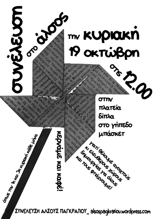 Συνέλευση και καφές στο άλσος την κυριακή 19/10 στις 12:00 στην στρογγυλή πλατεία δίπλα στο γήπεδο μπάσκετ - όπως την 1η και 3η κυριακή κάθε μήνα.