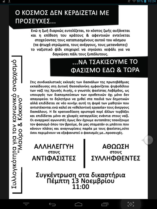 Το εργατικό και συνδικαλιστικό κίνημα οφείλει να απαντάει στις φασιστικές και ναζιστικές προκλήσεις και όχι απλά να περιμένει τις κυβερνητικές απαγορεύσεις και φυλακίσεις των δολοφόνων γιατί θα βρεθεί προ εκπλήξεως. Δεν αρκεί να οχυρώνεται πίσω από το "αντιφασιστικό" καταστατικό της ΔΟΕ. Οι κατακτήσεις του εργατικού κινήματος δεν λειτουργούν άπαξ διαπαντός ανανεώνονται μέσα από τους μαχητικούς αγώνες των εργαζομένων. Εμείς οι αναρχικοί αγωνιστές δεν έχουμε αυταπάτες για το ρόλο του κράτους, των υπουργείων των θεσμών και της αστυνομίας που κάνει πλάτες στους φασίστες και τους υποδεικνύει αγωνιστές προς «αναγνώριση», όπως προσφάτως τον Γρηγόρη Τσιλιμαντό, του οποίου η χαλκευμένη δίωξη δεν κατόρθωσε να φτάσει ούτε καν στο ακροατήριο, καθώς κατέπεσαν οι κατηγορίες. Ξέρουμε ότι ο κόσμος δεν κερδίζεται με προσευχές και ότι ο φασισμός δεν νικιέται με καταγγελίες. Γι' αυτό τσακίζουμε τον φασισμό όπου πάει να σηκώσει κεφάλι εδώ και τώρα, εντείνουμε την κοινωνική δράση μέσα σε σχολεία, σχολές, εργασιακούς χώρους και γειτονιές.