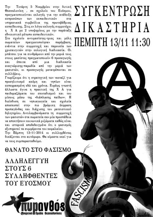 Συγκεντρωση αλληλεγγυης την Πεμπτη 13 Νοεμβριου 11.00 στα δικαστηρια Θεσσαλονικης.