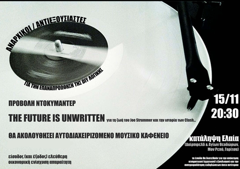 Προβολή του ντοκυμαντέρ "The Future Is Unwritten" για τη ζωή του Joe Strummer και την ιστορία των Clash. Θα ακολουθήσει αυτοδιαχειριζόμενο μουσικό καφενείο.