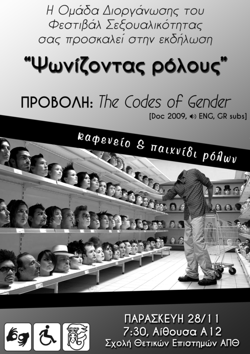 Η ομάδα διοργάνωσης του Φεστιβάλ Σεξουαλικότητας σάς προσκαλεί στην εκδήλωση "Ψωνίζοντας Ρόλους". Θα προσεγγίσουμε μαζί τα στερεότυπα στις διαφημίσεις μέσα από ένα ντοκιμαντέρ, συζήτηση και παιχνίδια ρόλων.