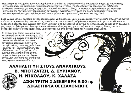 Τα ξημερώματα της Δευτέρας 26 Νοέμβρη 2007 στη Θες/νίκη προσάγεται από ασφαλίτες ο αναρχικός Βαγγέλης Μποτζατζής ενώ βρισκόταν στο σπίτι της συντρόφου του. Οδηγείται στα κτήρια της ασφάλειας Θες/νίκης όπου κρατείται πολλές ώρες σε καθεστώς πλήρους απομόνωσης. Τις επόμενες μέρες τίθεται σε εφαρμογή μια επιχείρηση τρομοκράτησης του αναρχικού χώρου της Θες/νίκης, με προσαγωγές συντρόφων στη Γ.Α.Δ.Θ., εφόδους σε σπίτια για έρευνες, αποκλεισμός της ευρύτερης περιοχής της Άνω Πόλης με κλούβες των ματ και ασφαλίτες.