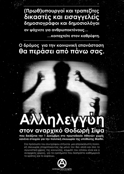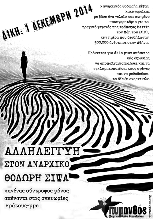 Οι διωκτικές αρχές φόρτωσαν στον σύντροφο Θοδωρή Σίψα τον θάνατο 3 ανθρώπων, βάση ενός ανώνυμου (!) σημειώματος, με μόνο πραγματικό λόγο το ότι είναι αναρχικός και συμμετείχε μαζί με χιλιάδες διαδηλωτές στην πορεία της 5ης Μάη. Η υπόθεση του Θ. Σίψα αποτελεί μία από τις πιο ξεκάθαρες απόπειρες στοχοποίησης της πολιτικής ταυτότητας «αναρχικός». Δεν είναι τυχαίο άλλωστε πως η υπόθεση ανασύρθηκε ξανά μόλις λίγες μέρες μετά τη δολοφονία τους Παύλου Φύσσα, σε μια προσπάθεια εξίσωσης των δύο γεγονότων- σε μία προσπάθεια εξίσωσης των «δύο άκρων» Το ελληνικό κράτος ανασύρει την υπόθεση της Μarfin κάθε φορά που θέλει να παρουσιάζεται ως εγγυητής της κοινωνικής ομαλότητας ταυτίζοντας τη «βία των άκρων», για την διατήρηση της κυριαρχίας του.