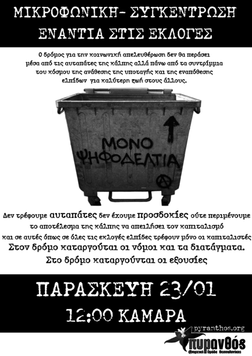 Δεν ψηφίζουμε, δεν νομιμοποιούμε καμία εξουσία να διευθύνει τους καταπιεσμένους, ούτε στον εαυτό μας άλλωστε αναγνωρίζουμε αυτό το δικαίωμα, όμως πράττουμε πιο έντονα από ποτέ, διαμορφώνουμε το ρεύμα του μέλλοντος, τον Κοινωνικό Αναρχισμό, μαζί με τους εκμεταλλευόμενους, τους καταπιεσμένους, ντόπιους και μετανάστες, αυτός είναι ο μόνος τρόπος να είμαστε χρήσιμοι στην υπόθεση της Κοινωνικής Επανάστασης, να είμαστε χρήσιμοι στην υπόθεση της Κοινωνική Απελευθέρωσης.