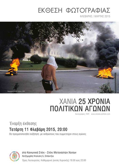 Το Κοινωνικό Στέκι - Στέκι Μεταναστών, οργανώνει έκθεση φωτογραφίας με στιγμές των τελευταίων 25 χρόνων πολιτικών αγώνων στα Χανιά. από τις 11 Φεβρουαρίου όπου την πρώτη μέρα θα γίνει συζήτηση με ανθρώπους που συμμετείχαν