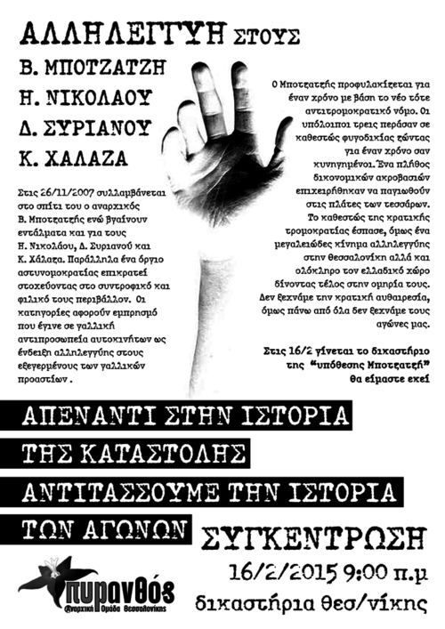 Συγκέντρωση αλληλεγγύης στους Β. Μποτζατζή, Η. Νικολάου, Δ. Συριανού και Κ. Χάλαζα