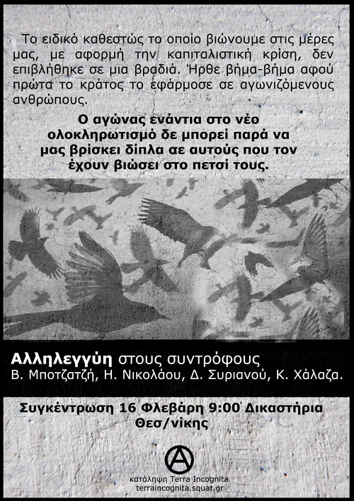 Συγκέντρωση αλληλεγγύης στα δικαστήρια Θεσσαλονίκης Δευτέρα 16 Φεβρουαρίου στις 09:00