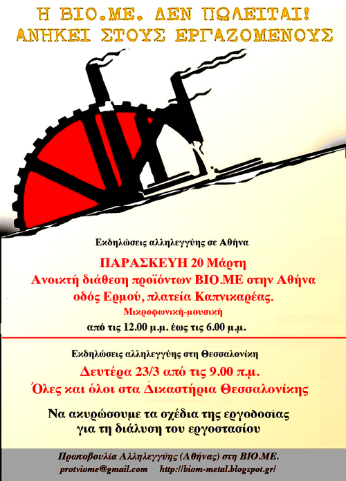 Στηρίζουμε τον αγώνα των εργαζομένων της Βιο.Με. και είμαστε ενάντια σε οποιαδήποτε ενέργεια θέλει να πλήξει το εγχείρημα, ξεπουλώντας το εργοστάσιο που τόσο καιρό οι εργαζόμενοι κρατάνε ζωντανό. Δηλώνουμε την αλληλεγγύη μας για να νικήσει η αυτοδιαχείριση.