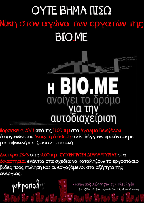 Ως κοινωνικός χώρος για την ελευθερία Μικρόπολις σταθήκαμε δίπλα στους εργαζόμενους της Βιο.Με. από την αρχή του αγώνα τους. Η αυτοδιαχείριση του εργοστασίου της Βιο.Με. χαράζει ένα νέο δρόμο, απαλλαγμένο από σχέσεις εξουσίας στους χώρους εργασίας.