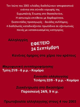 Τον Ιούνη του 2003 χιλιάδες διαδηλώνουν αποφασιστικά ενάντια στη σύνοδο κορυφής της Ε.Ε. στη Θεσσαλονίκη. Η αστυνομία επιτίθεται με βαρβαρότητα. Εκατοντάδες προσαγωγές - δεκάδες συλλήψεις. 4 διαδηλωτές καταδικάζονται πρωτόδικα σε εξοντωτικές ποινές με κατασκευασμένες κατηγορίες.