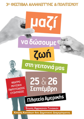 Ελάτε σε μια συνάντηση πολιτισμών και αλληλεγγύης, για να γιορτάσουμε όσα μας ενώνουν, γιατί είμαστε φίλοι και συγκάτοικοι, γιατί μαζί δίνουμε ζωή στη γειτονιά μας.