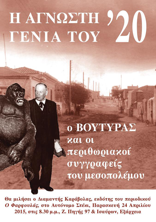Για το θέμα θα μιλήσει ο Διαμαντής Καράβολας, εκδότης του περιοδικού Ο Φαρφουλάς, στο Αυτόνομο Στέκι, την Παρασκευή 24 Απριλίου 2015, στις 8.30 μ.μ., Ζ. Πηγής 27 και Ισαύρων, Εξάρχεια.