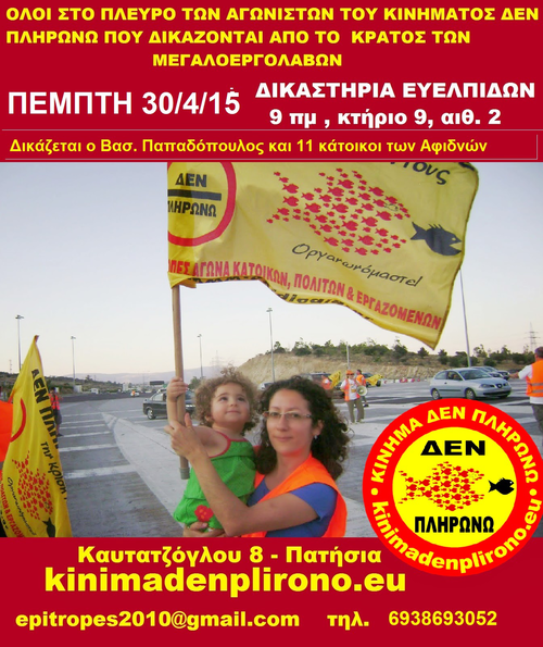 Νέα Οδός Α.Ε. vs Κίνημα Δεν Πληρώνω και 11 κατοίκους Αφιδνών.Κατηγορούμενοι ο Βασίλης Παπαδόπουλος και άλλοι έντεκα κάτοικοι του Δήμου Ωρωπού για τη δράση του Κινήματος ενάντια στα διόδια.____________________________________