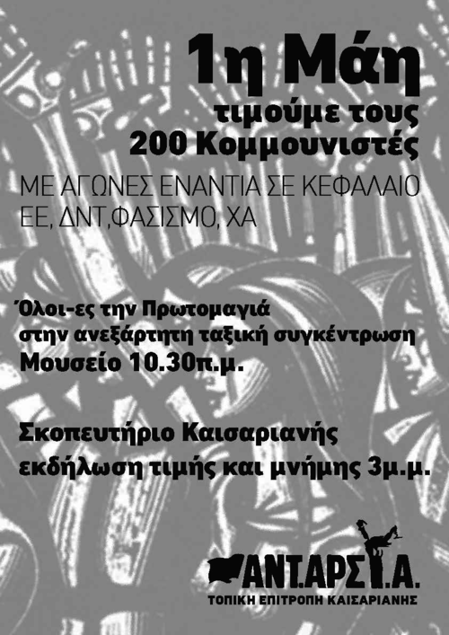 Η θυσία των 200 κομμουνιστών του, του ΕΑΜ, του ΕΛΑΣ, της ΕΠΟΝ, του ΔΣΕ, και όλων των νεκρών του εργατικού κινήματος, η αντιφασιστική νίκη των λαών αποτελούν επαναστατική παρακαταθήκη για την κατάργηση της εκμετάλλευσης ανθρώπου από άνθρωπο, για την έφοδο στον ουρανό, για την κοινωνική χειραφέτηση και τον κομμουνισμό. Χρειαζόμαστε ένα σύγχρονο Σικάγο, μια νέα χάρτα εργατικών δικαιωμάτων και θεσμών, μια νέα κοινωνική οργάνωση χωρίς αφεντικά και κεφάλαιο, χωρίς ΕΕ ευρώ , χρέος, ΔΝΤ, φτώχεια, φασισμό, Χρυσή Αυγή. Με την εργατική τάξη στο τιμόνι, με ένα ταξικό εργατικό κίνημα παλεύουμε για μια κοινωνία ελεύθερη από τα δεσμά του κεφαλαίου. Δε ζητάμε πολλά τα θέλουμε όλα!