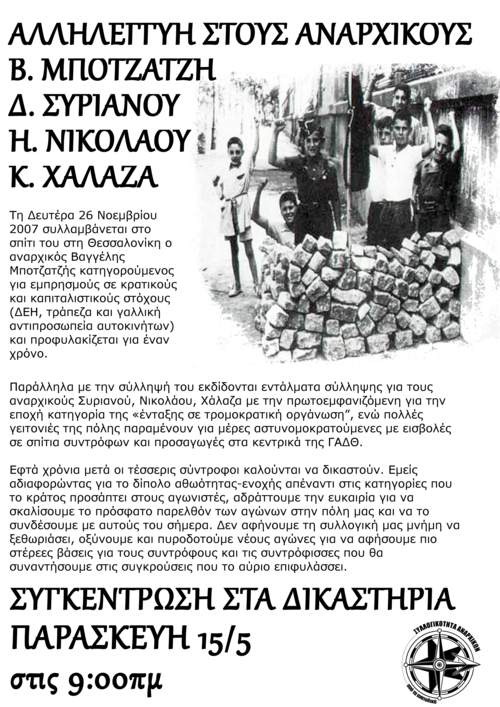 Τη Δευτέρα 26 Νοεμβρίου 2007 συλλαμβάνεται στο σπίτι του στη Θεσσαλονίκη ο αναρχικός Βαγγέλης Μποτζατζής κατηγορούμενος για εμπρησμούς σε κρατικούς και καπιταλιστικούς στόχους (ΔΕΗ, τράπεζα και γαλλική αντιπροσωπεία αυτοκινήτων) και προφυλακίζεται για έναν χρόνο.