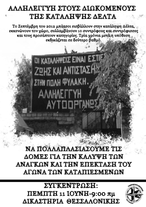 Αλληλεγγύη στους διωκόμενους της κατάληψης Δέλτα. Σύγκεντρωση στα δικαστήρια Πέμπτη 11 Ιουνίου στις 9:00